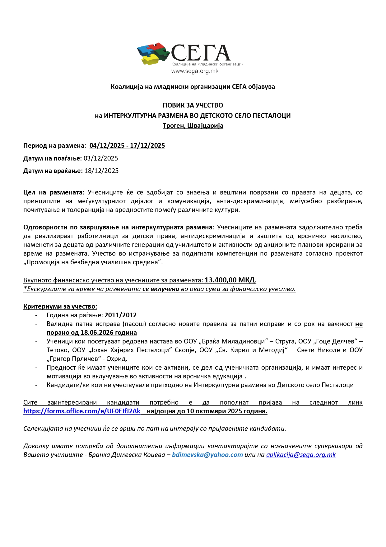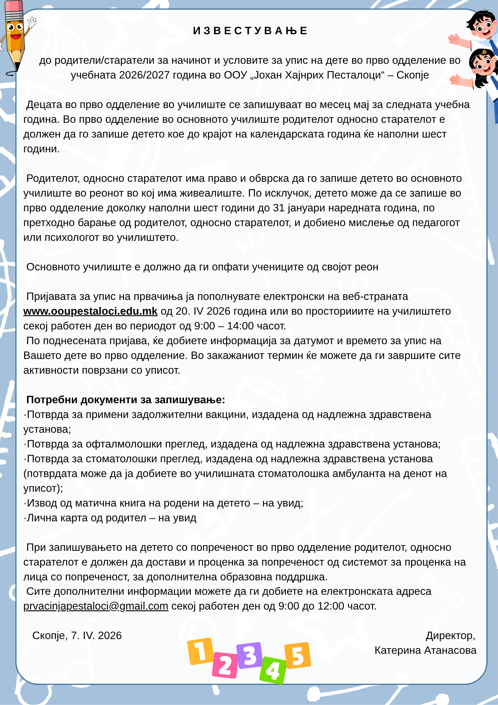 СООПШТЕНИЕ ЗА ПРИЕМ НА ПРВАЧИЊАТА ВО УЧЕБНАТА 2024/2025 ГОДИНА2024-08-27 10:38:18прочитајте повеќе ИЗВЕШТАЈ ОД ИЗВРШЕНАТА САМОЕВАЛУАЦИЈА ООУ „Јохан Хајнрих Песталоци“2023-09-25 12:02:27прочитајте повеќе СООПШТЕНИЕ ЗА ПРИЕМ НА ПРВАЧИЊАТА2023-08-28 10:16:26Драги првачиња, почитувани родители, Основното општинско училиште „Јохан Хајнрих Песталоци“ – Скопје ве известува дека на 1 септември ќе организира свечен прием на првачињата во учебната 2023/2024 година. Приемот ќе започне во 10:00 часот и ќе се одвива во свечената сала на Училиштето. Наставничкиот колегиум на Училиштето со нетрпение ве очекува и ви посакува среќен почеток на новата животна патека, исполнета со другарување, авантури и усвојување нови знаења и животни вештини. Директор, Катерина Атанасовапрочитајте повеќе Студенти од Архитектонскиот факултет - за „Песталоци“2022-10-03 20:18:46„Песталоци“ не е само училиште. „Песталоци“ е втор дом и место за дружба и рекреација на многумина. Група поранешни ученици, родители и ентузијасти пред неколку години почнаа да организираат активности со цел да го разубават и да го направат попристапен училишниот двор. Целта на ваквите активности е секој, во рамките на своите знаења, можности и афинитети, да придонесе кон развивање пријателска и функционална урбана средина. Водени од мотото „Не што може да направи училиштето за мене, туку што јас можам да направам за него“, студентите од IV и од VI семестар на Архитектонскиот факултет при универзитетот „Св Кирил и Методиј“ заедно со проф. д-р Дивна Пенчиќ, веќе ги почнаа активностите во рамки на предметот Одржлив урбан развој. Во текот на вчерашниот ден во нашето училиште никнаа неколку креативни решенија, кои му вдахнаа нов дух и свежина на просторот. Нивните активности продолжуваат, а ние со радост ќе ги споделуваме сите активности и резултатите што ќе произлезат од оваа соработка.прочитајте повеќе Посета на Меморијалниот центар на холокаустот на Евреите од Македонија2022-09-24 20:01:27На 23 септември, група ученици, заедно со наставниците Бранка Димевска Коцева и Александар Чавкароскии, го посетија Меморијалниот центар на холокаустот на Евреите од Македонија, во рамки на Европските денови на културното наследство. Учениците ја разгледаа постојаната поставка заедно со Жаклина Мучева и научија повеќе за животот на Евреите, нивното културно материјално и нематеријално наследство, слушнаа историски факти за депортацијата на македонските Евреите и возобновувањето на Еврејската заедница. Научија нови термини: Тора, синагога, менора, ладино јазик, сефардски поговорки, но го видоа и најзначајниот артефакт во Меморијалниот центар. Сето ова беше добра основа за размисли, дискусија и инспирација за реализација на работилницата „Истражуваме, создаваме и културното наследство го чуваме“. Под менторство на нивните наставници и тимот од Меморијалниот центар, Лилјана Лазаревска, Маја Јаневска Илиева, Дарко Хелман и Сашо Андоновски ги создадоа своите уметнички творби инспирирани од поставката која ја посетија. Работеа во четири техники и изработија прекрасни уметнички дела. Изработките се изложени во приземниот дел на Меморијалниот центар и сите посетители ќе можат да ја погледнат изложбата до 28 септември додека трае манифестацијата Европски денови на културно наследство. Уметничките трудови потоа ќе бидат сочувани во деп